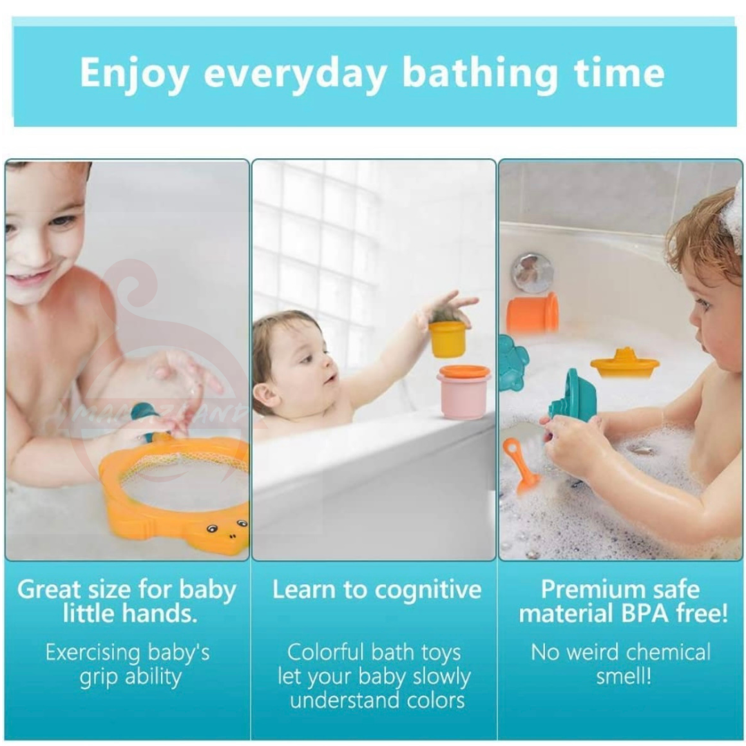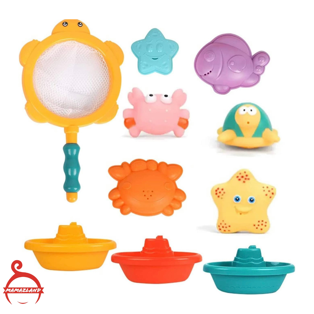 مجموعة من 10 قطع من ألعاب الاستحمام/الماء، بما في ذلك شبكة صيد وحيوانات مائية ناعمة عائمة.