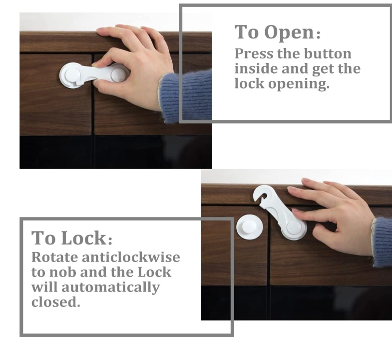 لا تتطلب براغي أو ثقوب حفر للأثاث أو الأجهزة؛ يتم إعداد الأقفال باستخدام لاصق 3M.