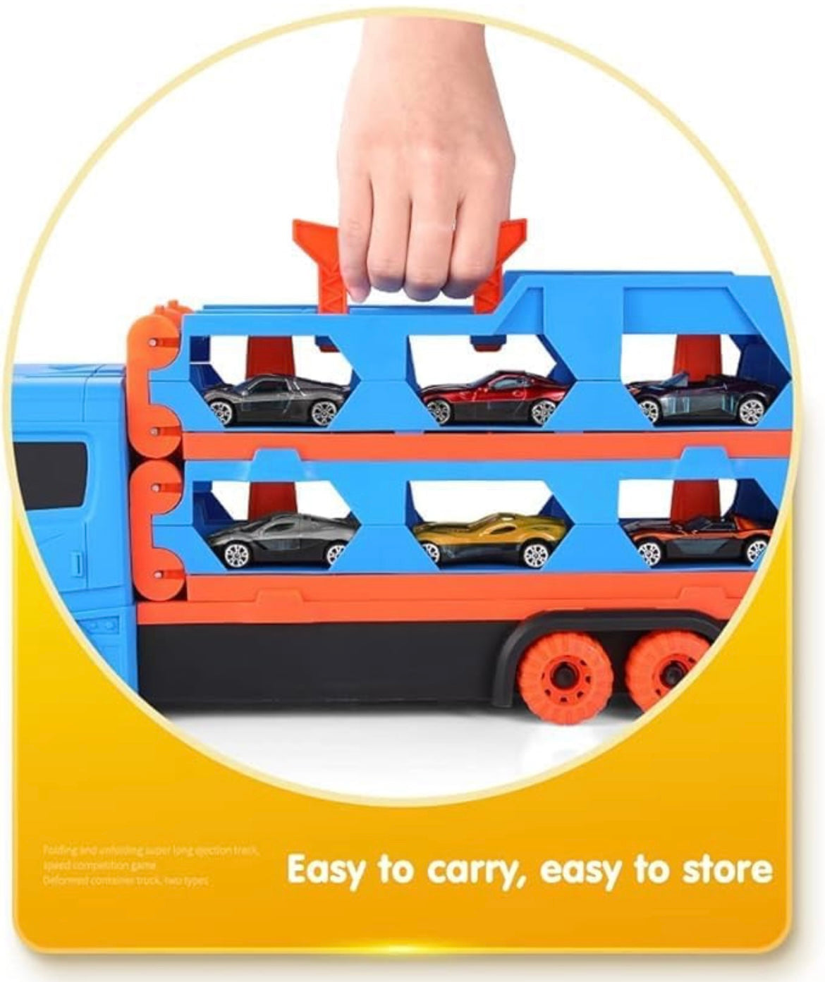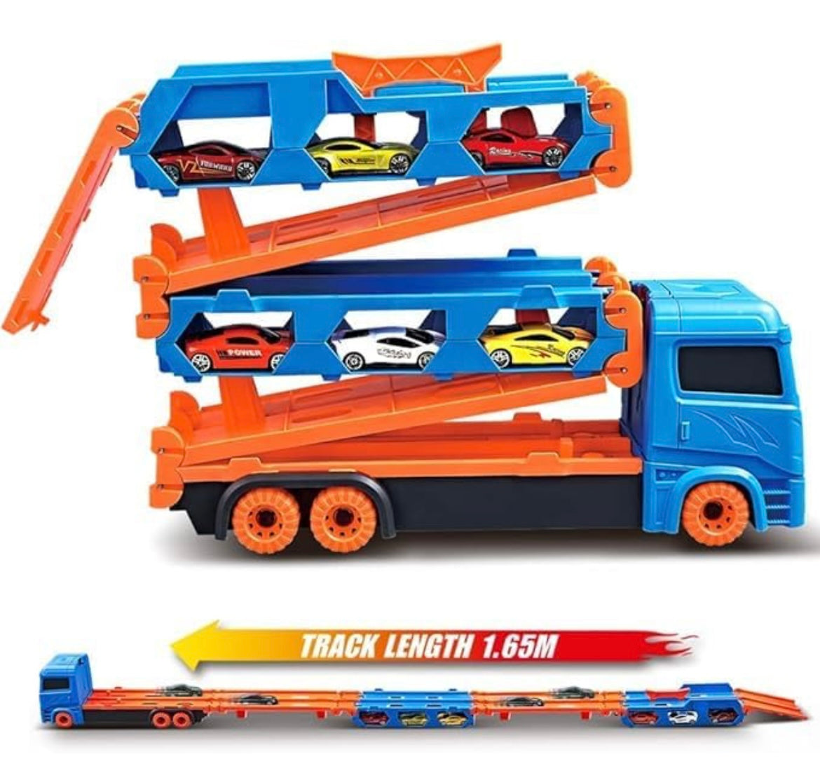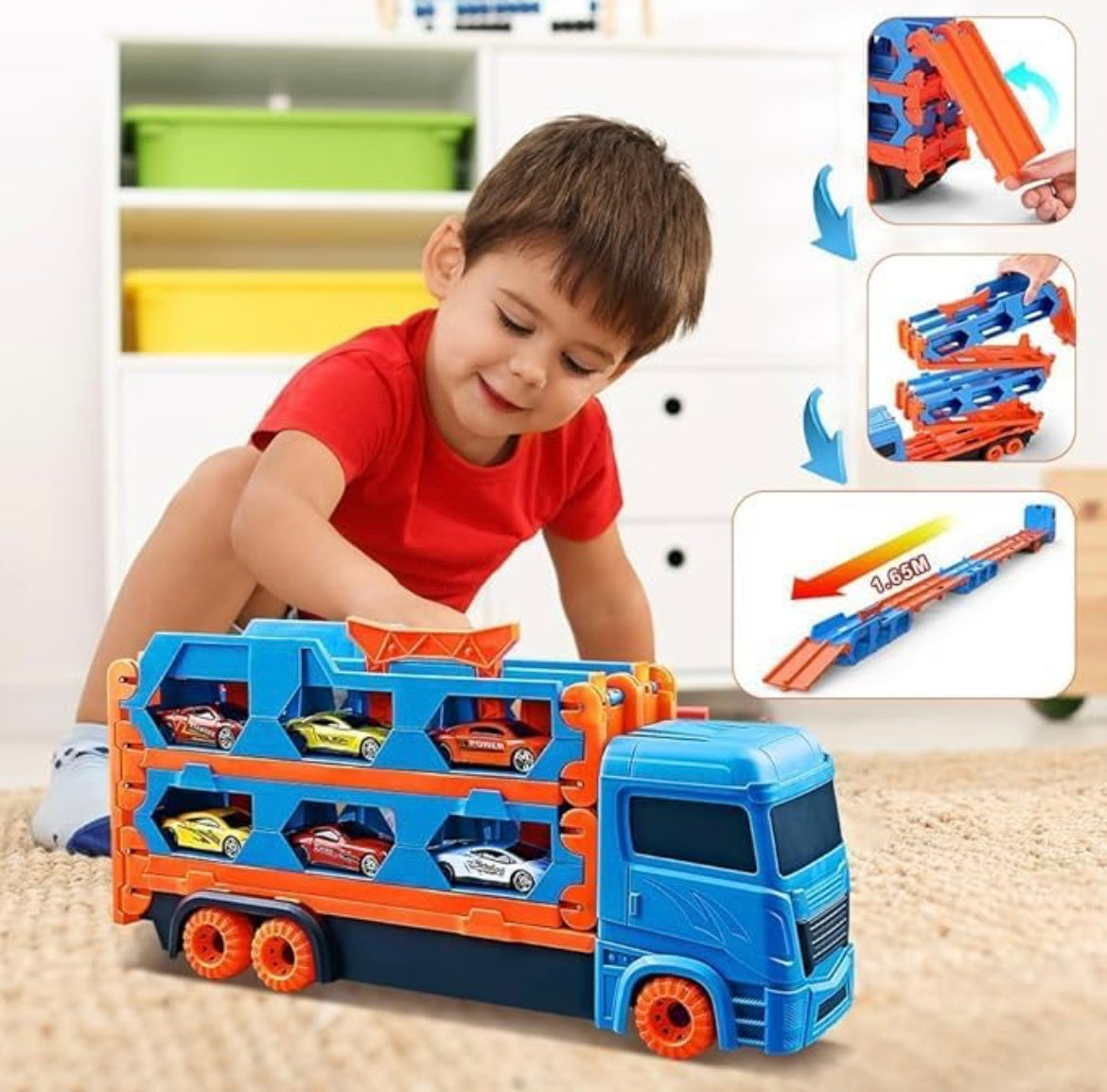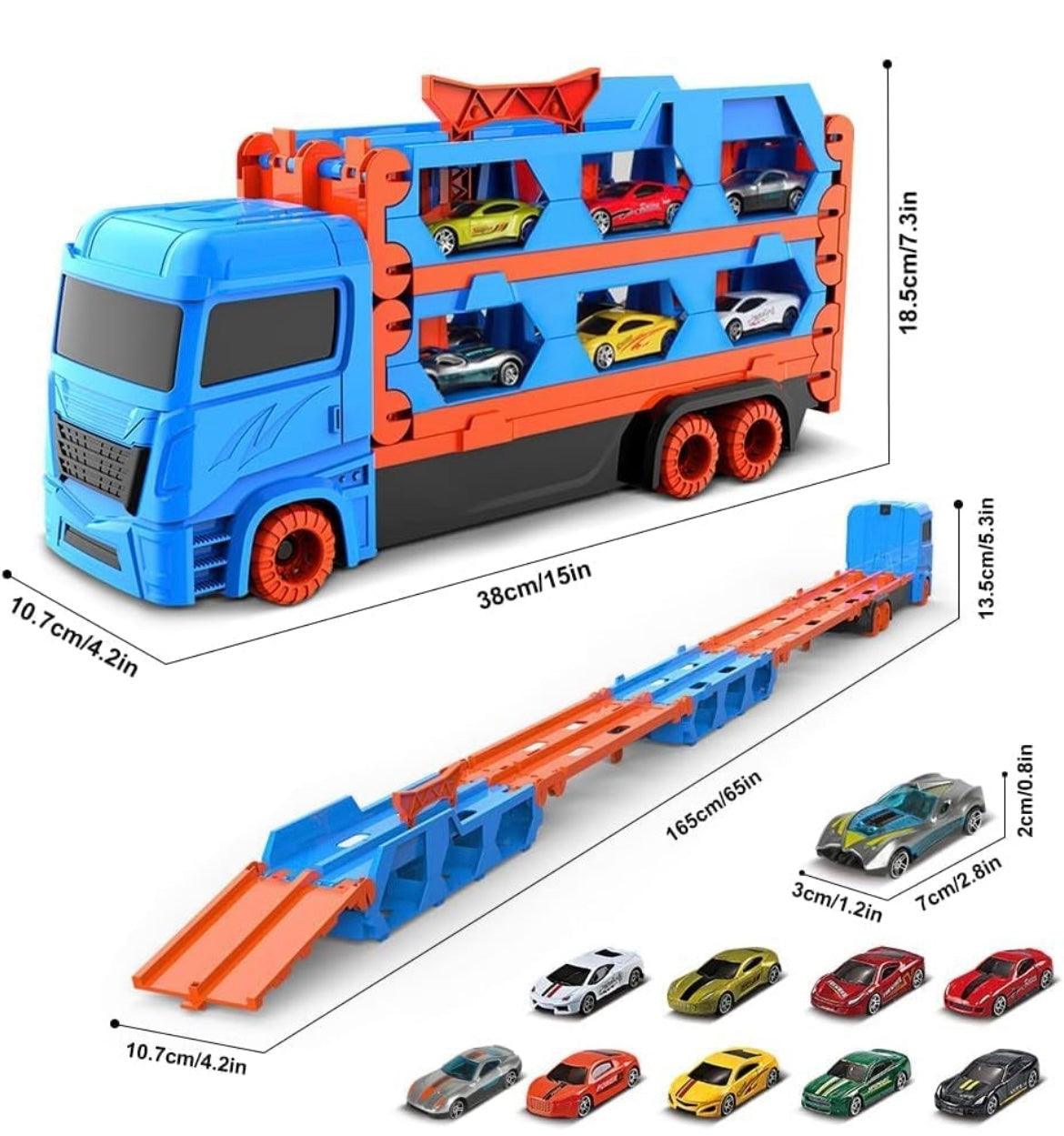 مجموعة ألعاب شاحنة النقل هذه ليست مجرد شاحنة، بل تُستخدم أيضًا لسباق السيارات. ضع المسار وانطلق على مسار بطول 1.65 متر مع سيارات لعب ملونة رائعة. بدون بطاريات، تُقذف السيارة لإكمال السباق.