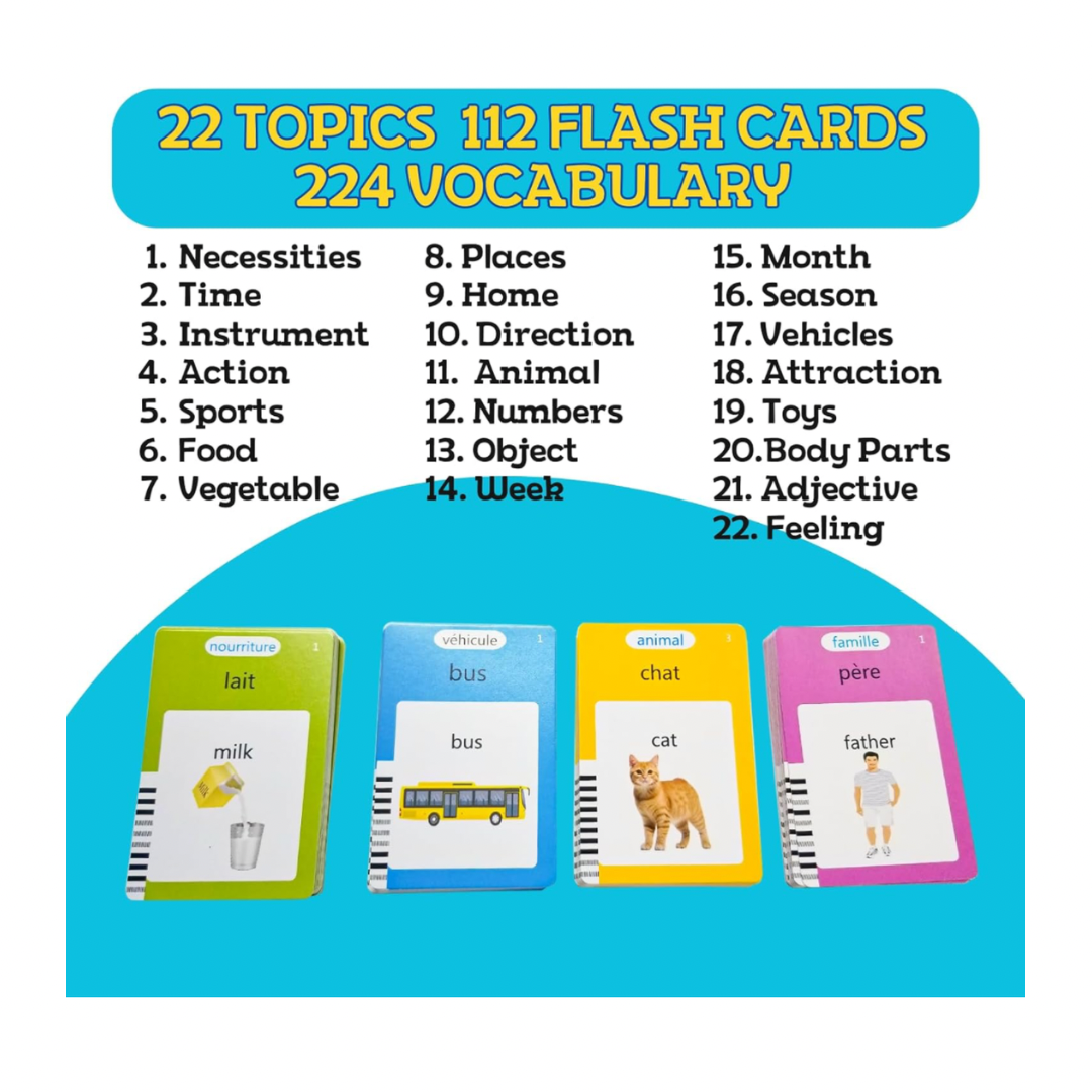 ترتبط البطاقات بفئات مختلفة، مثل الأشخاص والحيوانات والألوان ووسيلة النقل، ...